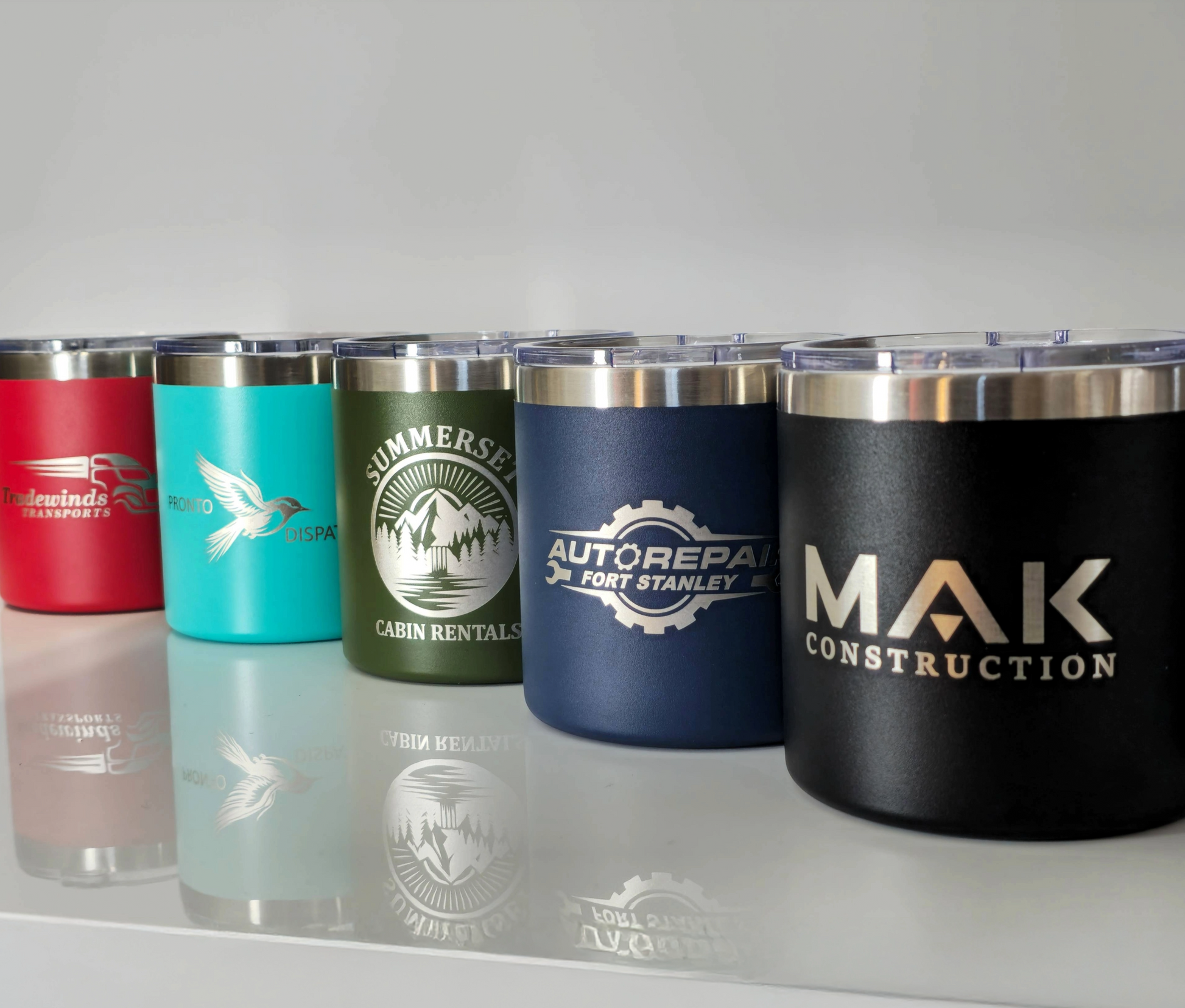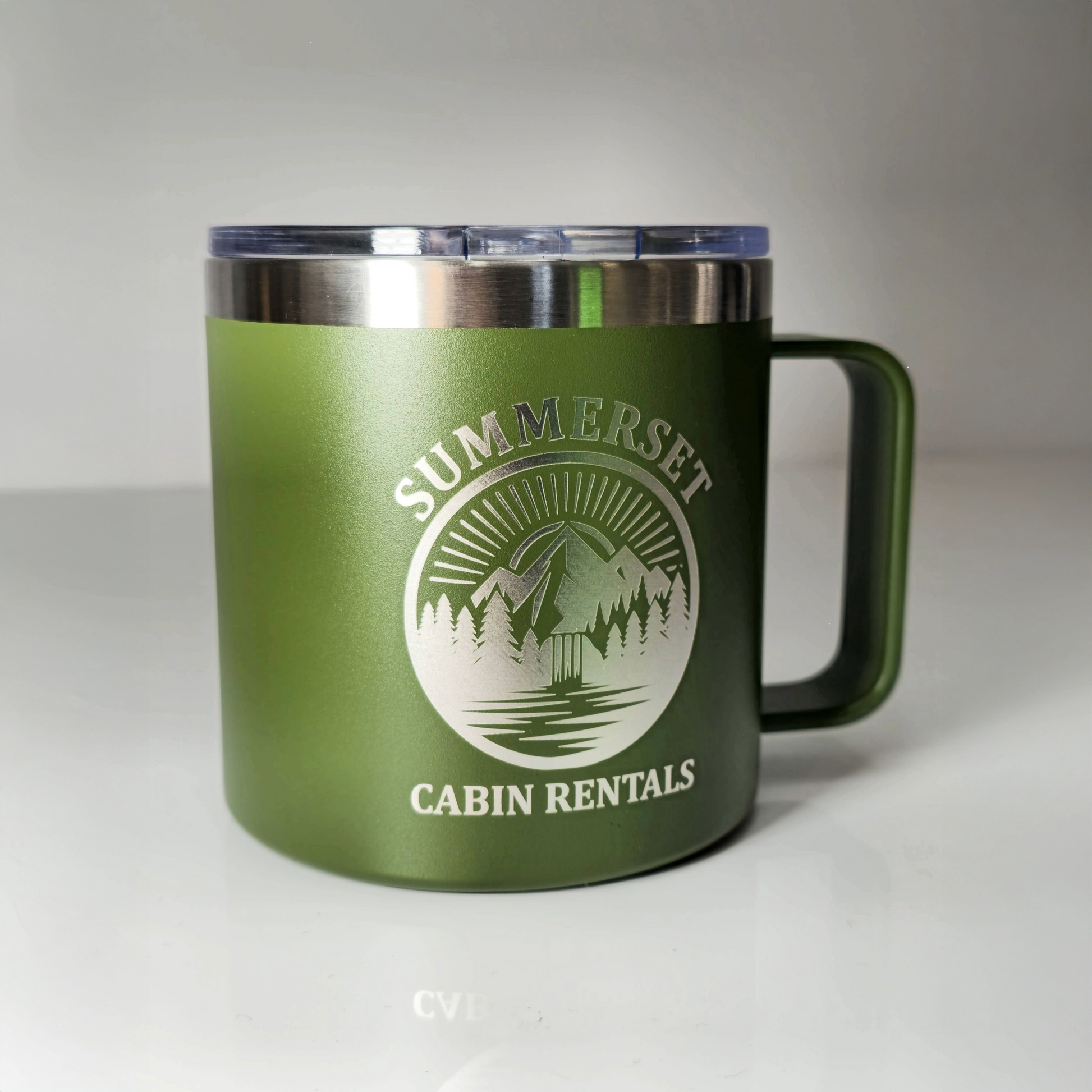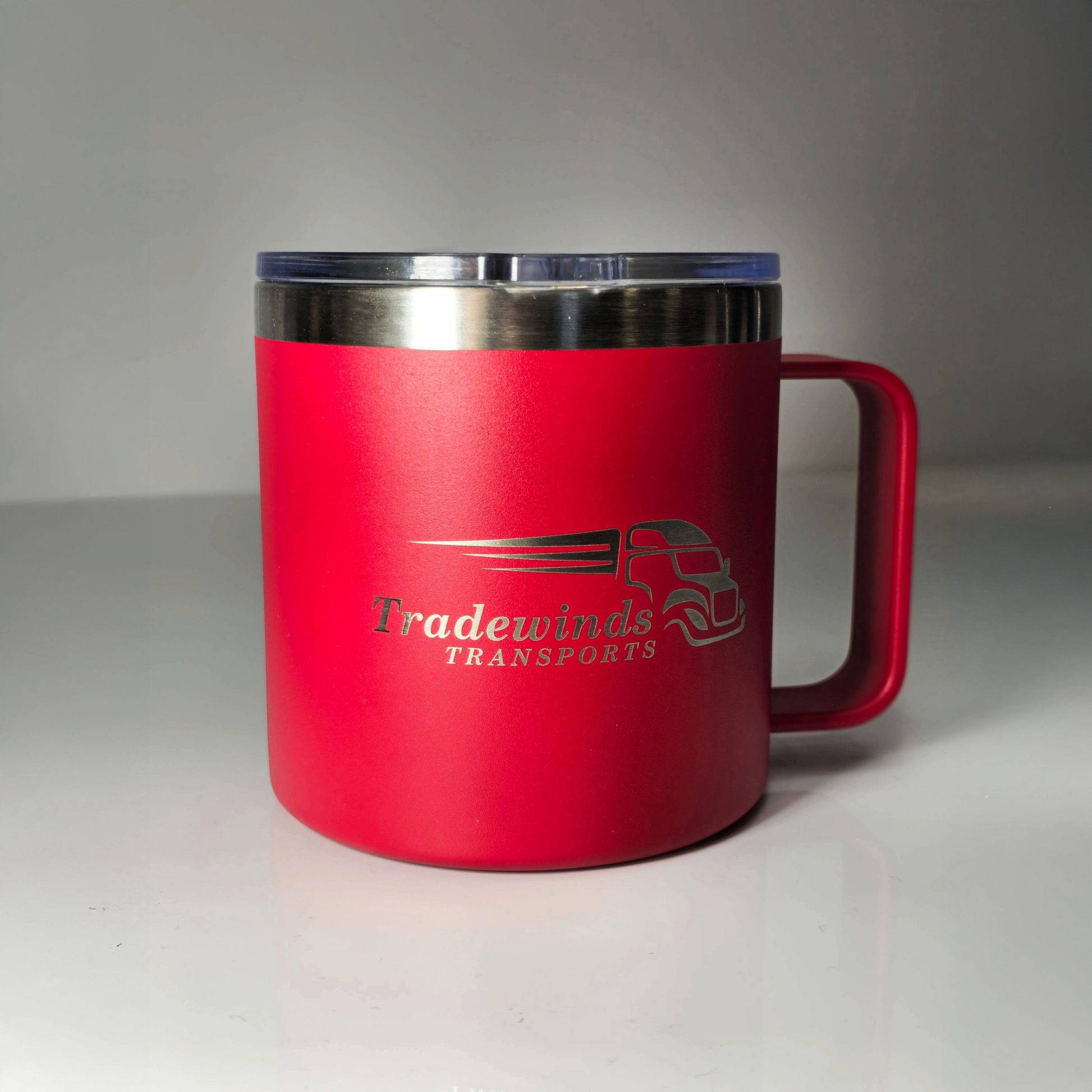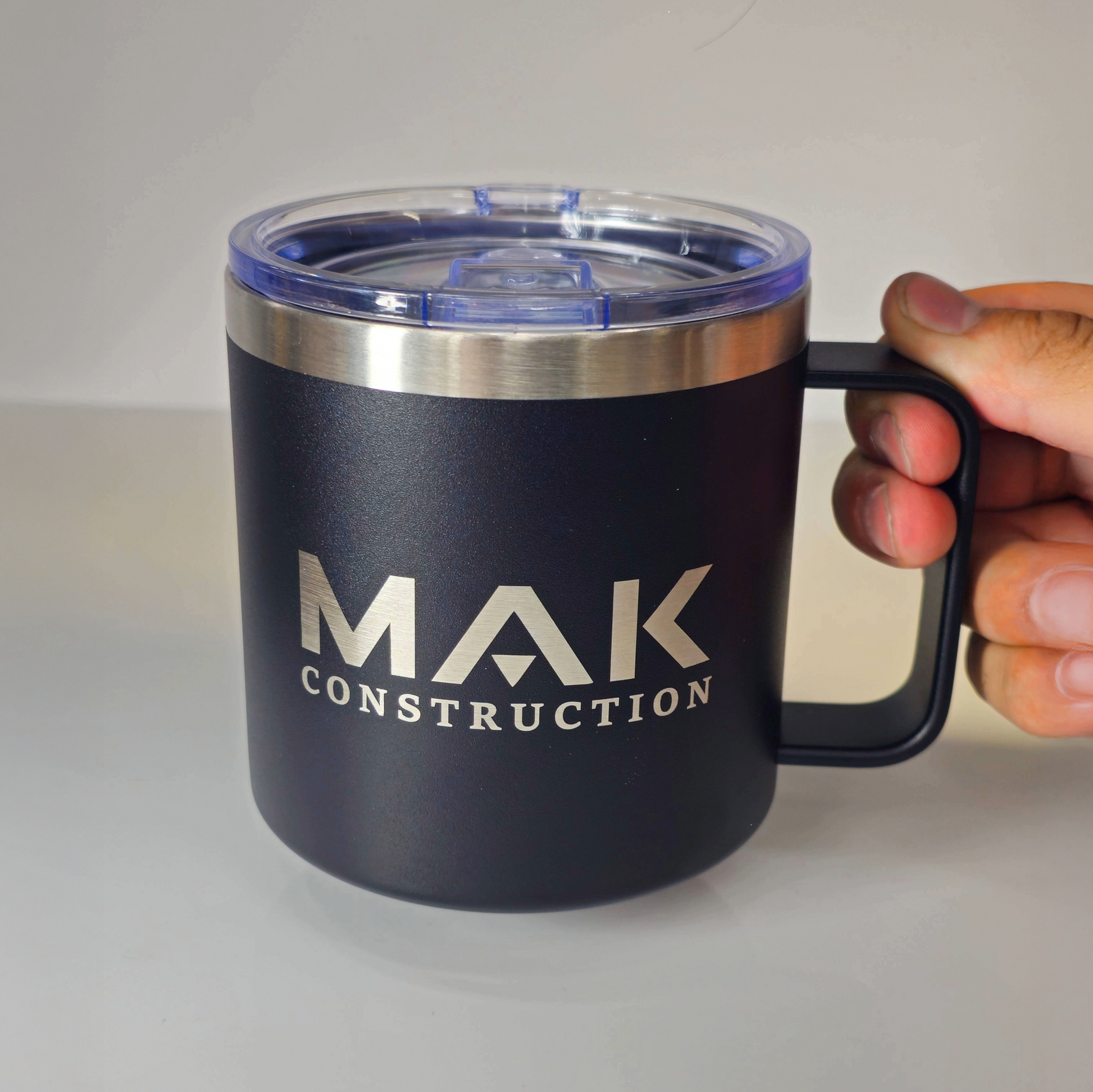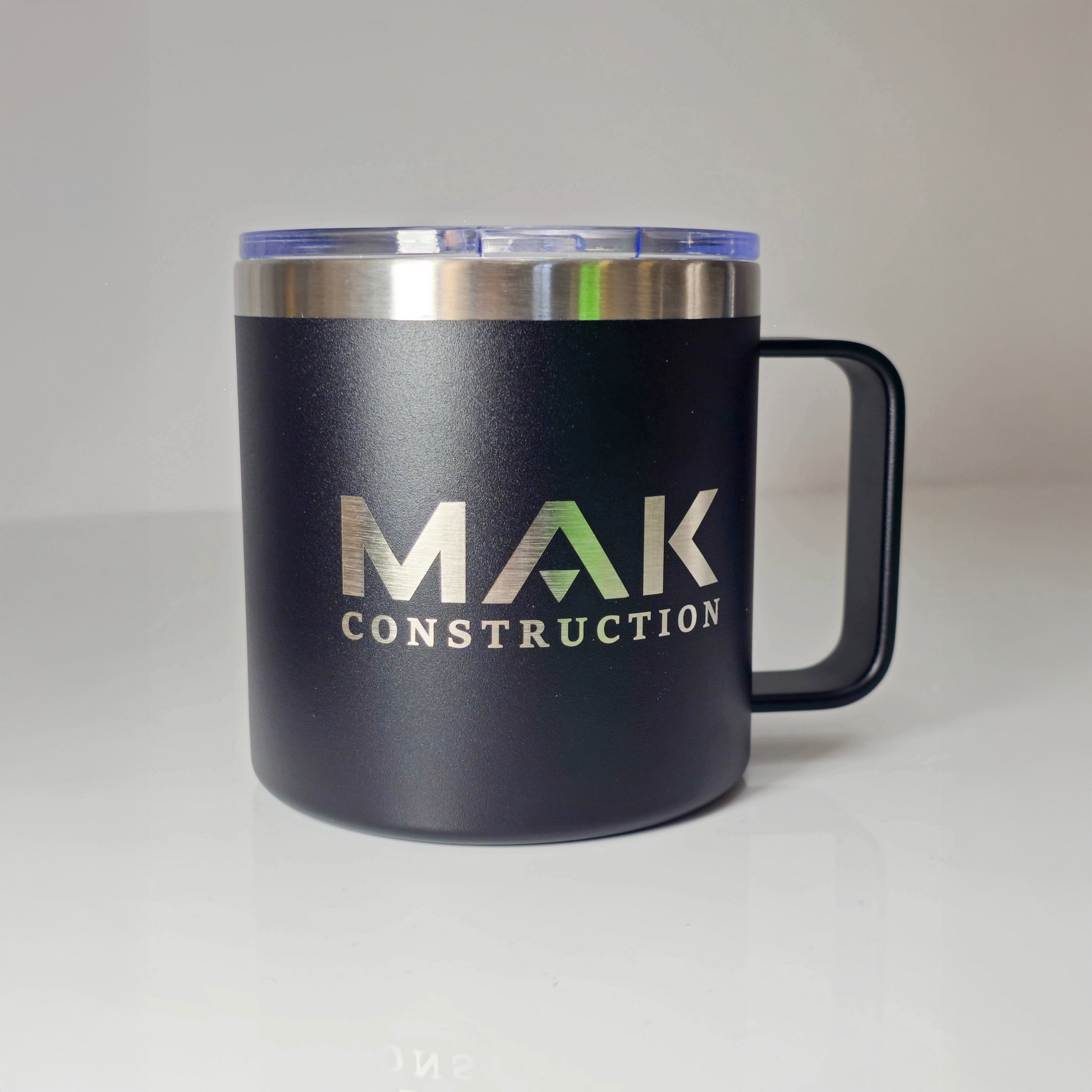 This 14oz double walled vacuum insolated coffee mug is built to last. Built with heavy duty stainless steel and a strong steel handle, this is a great mug for any jobsite or office. Our version comes standard with a plastic sliding lid and a powder coat finish to ensure long life and a new look to your cup and your logo.