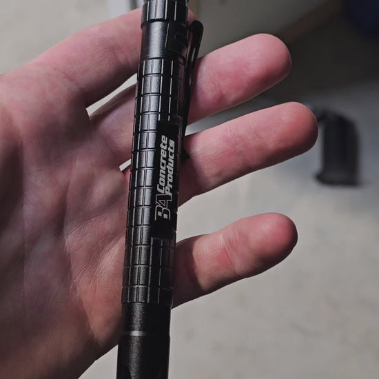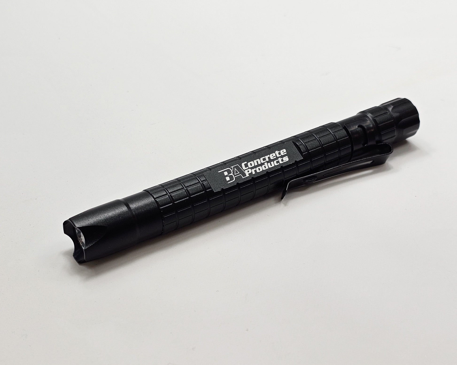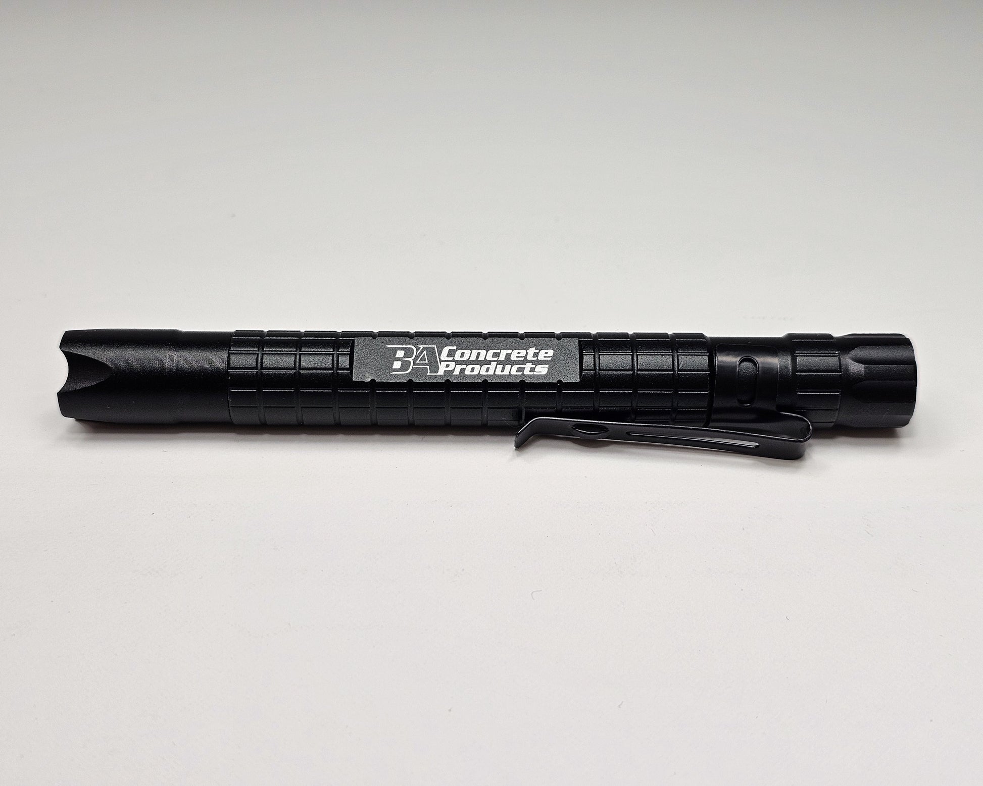 Our Textured LED flashlight takes 2 AAA batteries and comes with a detachable metal clip, allowing you to attach it to your pocket or reverse it to clip it to your cap. It has a long range beam and is strong enough for any application. A handy tool to throw in your bag, have around the house or carry in your pocket at work.
