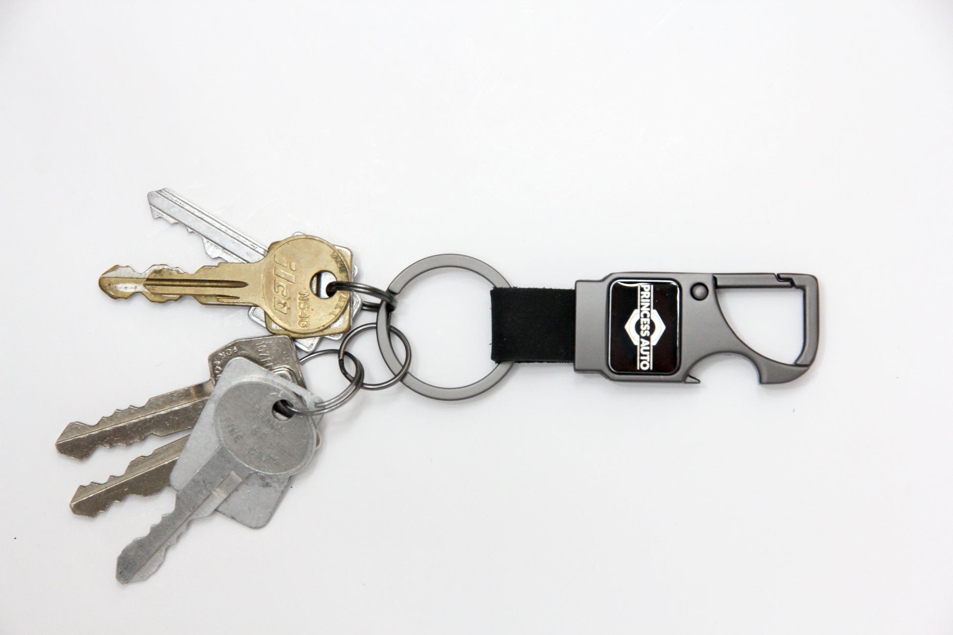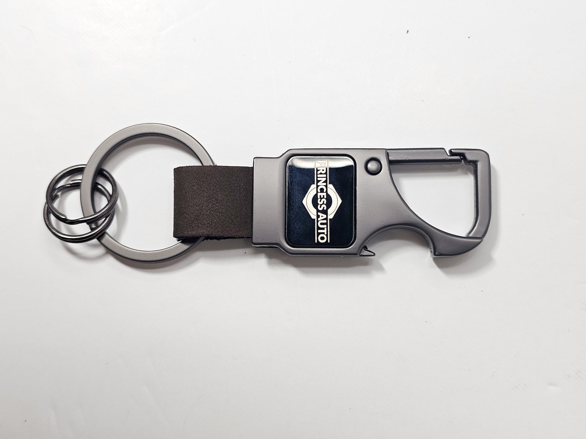 Our Carabiner key holder has a leather strap and built in bottle opener. between the 3 key loops that come with it, this product has all the capacity and room for any amount of product you could ever want to add to your keychain. It also has a reflective zinc alloy face that once engraved with your logo adds the finishing touch to an already great product.