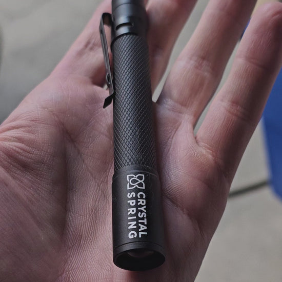 This is our Pro Tradesman flashlight. Designed to be a must have companion for the trades. This lamp has a circular lens which creates a perfectly even and circular light pool. This is ideal for anyone who wants the option of not having a highly concentrated light pool right in front of their face. Rather when the zoom is retracted, the user has a nice wide, even light pool to see what he or she is doing. But if you do sometimes need your flashlight to really reach out, no worries this light does that great. With its extendable zoom, you can get all the distance out of your light that you could practically need. Available in our keychain version or pocket clip. It has 3 modes. High, low, strobe. If the light has not been turned on for 1 minute then it resets to start at high mode next time it is turned on