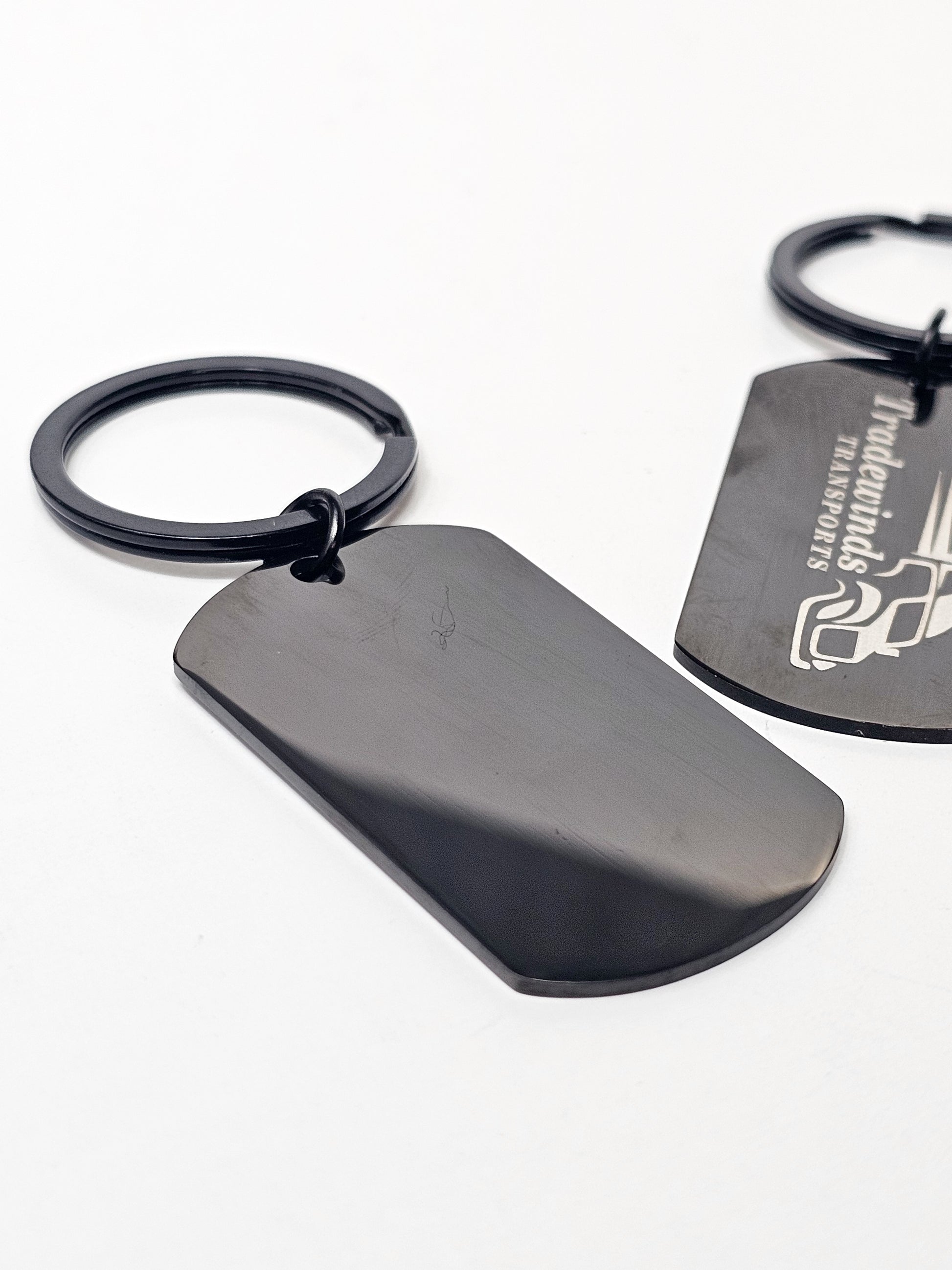 Zinc Alloy reflective tag style keychain. A nice way to personalize your keychain, this black reflective tag leaves a beautiful white mark when engraved.