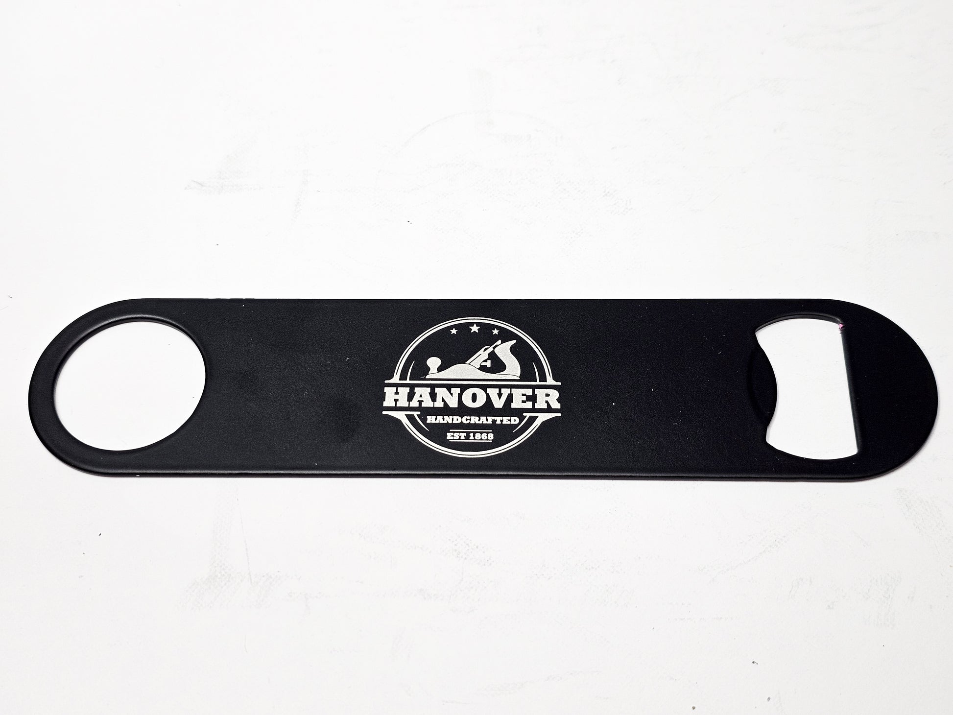 Stainless steel straight bottle opener. This bottle opener is 7 inches long and with its black paint finish takes a laser mark very well and makes any logo pop. I great household unit to have around.
